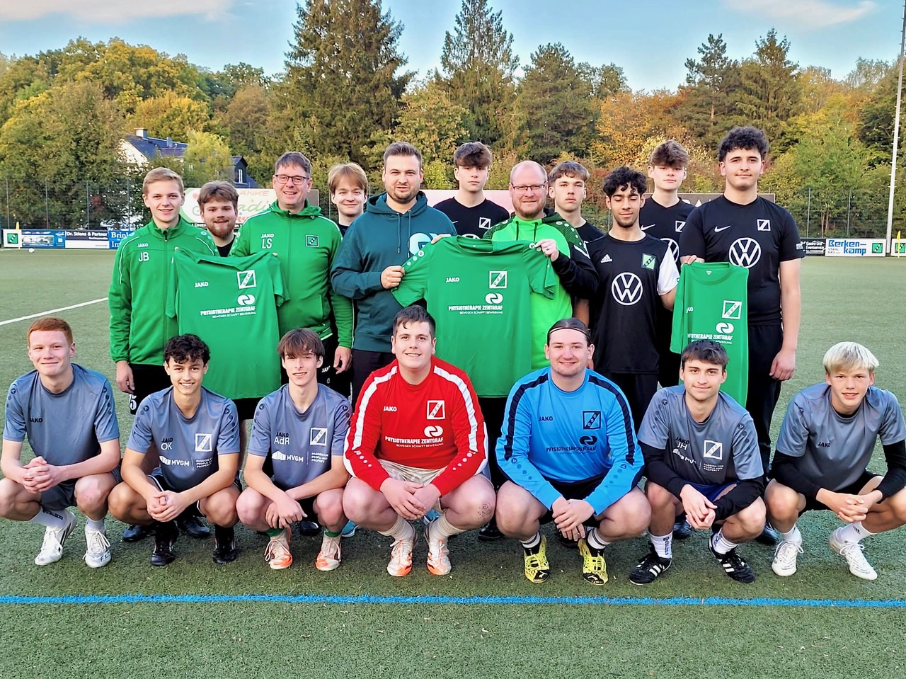 Cappenberg. Grün-Schwarz Cappenberg (GSC) dankt der Physiotherapie Zentgraf für den neuen Trikotsatz, in dem künftig die A-Jugend des GSC aufläuft. Inhaber Michel Zentgraf (auf dem Foto 5.v.l. in der hinteren Reihe), selbst engagierter Ehrenamtlicher im Verein, unterstützt die ältesten GSC-Junioren mit dieser Ausstattung vorbildlich und damit seinen Fußballklub nicht zum ersten Mal. Die Truppe der Trainer Marc Stommer (nicht im Bild), Lars Schade und Guido Hoffmann (v.l.) mit Spielern wie Torwart Leon Sagur, Johann Bruno Bernemann, Abdullah Abu Jwhar, Jonas Burchardt oder Joost Lipke steht derzeit auf dem zweiten Tabellenplatz ihrer Kreisliga, strebt aber weitere Erfolge an ganz im Sinne des Slogans von Sponsor Pysiotherapie Zentgraf „Bewegen schafft Bewegung“. Foto: GSC